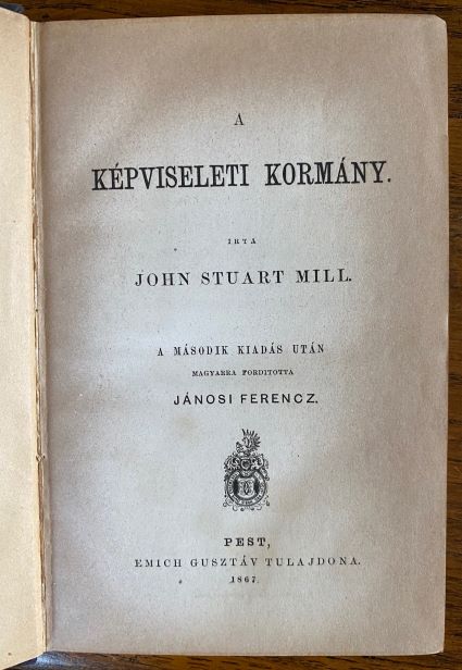 MILL,John Stuart. A képviseleti kormány. A Második Kiadás után Magyarra forditotta Jánosi Ferencz. Pest, Emich Gusztáv Tulajdona, 1867