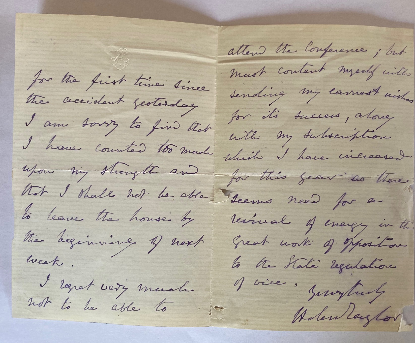 Helen Taylor writes that she is unable to leave Avignon to attend ‘the conference of 18th March’ as she is recovering from ‘the effects of a carriage accident’. She sends £5 ‘my subscription which I have increased for this year as there seems need for a renewal of energy in the great work of opposition to the State regulation of vice’.