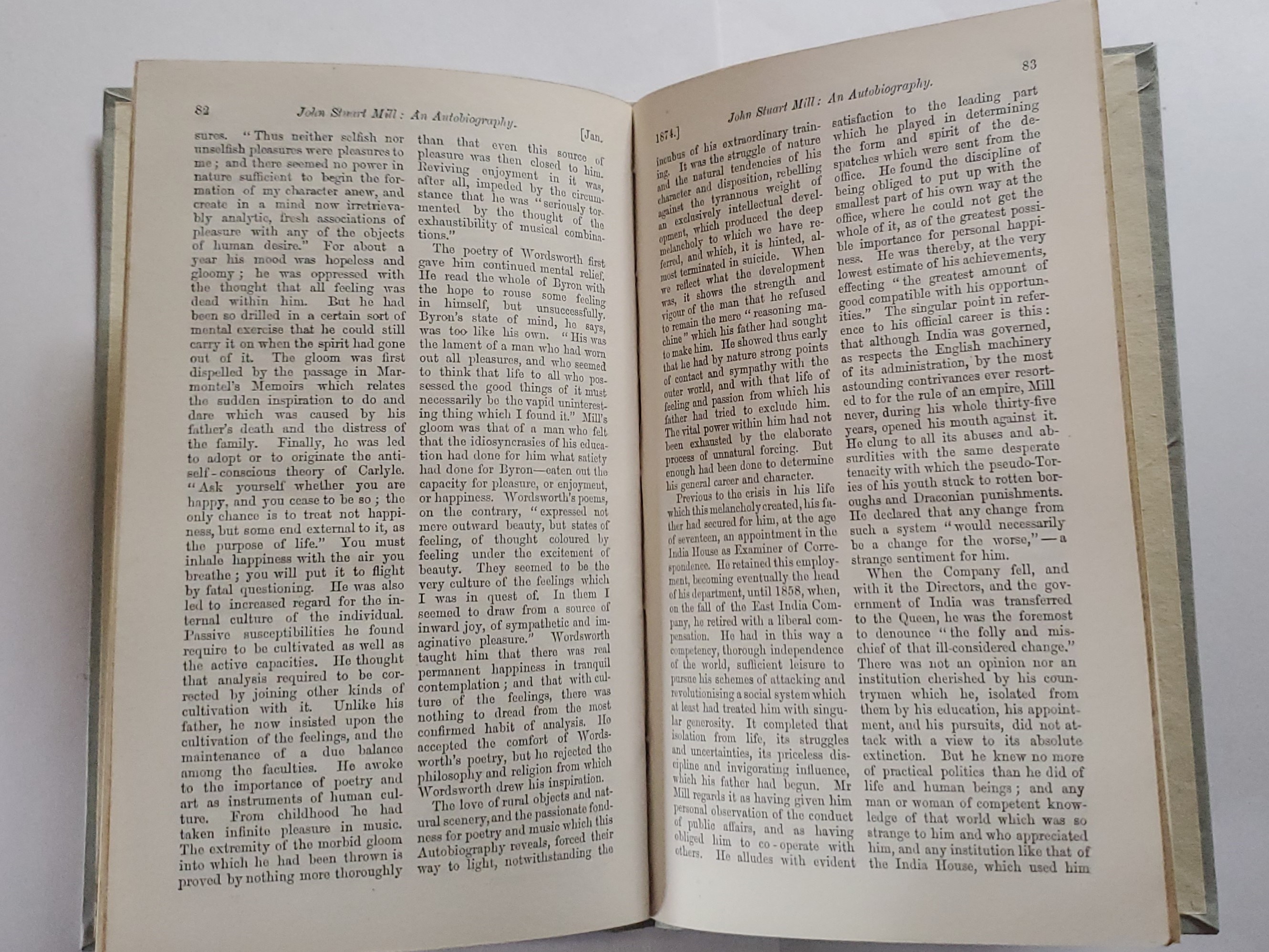 COWELL, Herbert John Stuart Mill: An Autobiography. [Extracted from Blackwoods Edinburgh Magazine] Blackwoods Edinburgh Magazine 1874 Octavo, pp.75-93, boards, paper label to upper cover. £50 ref:189