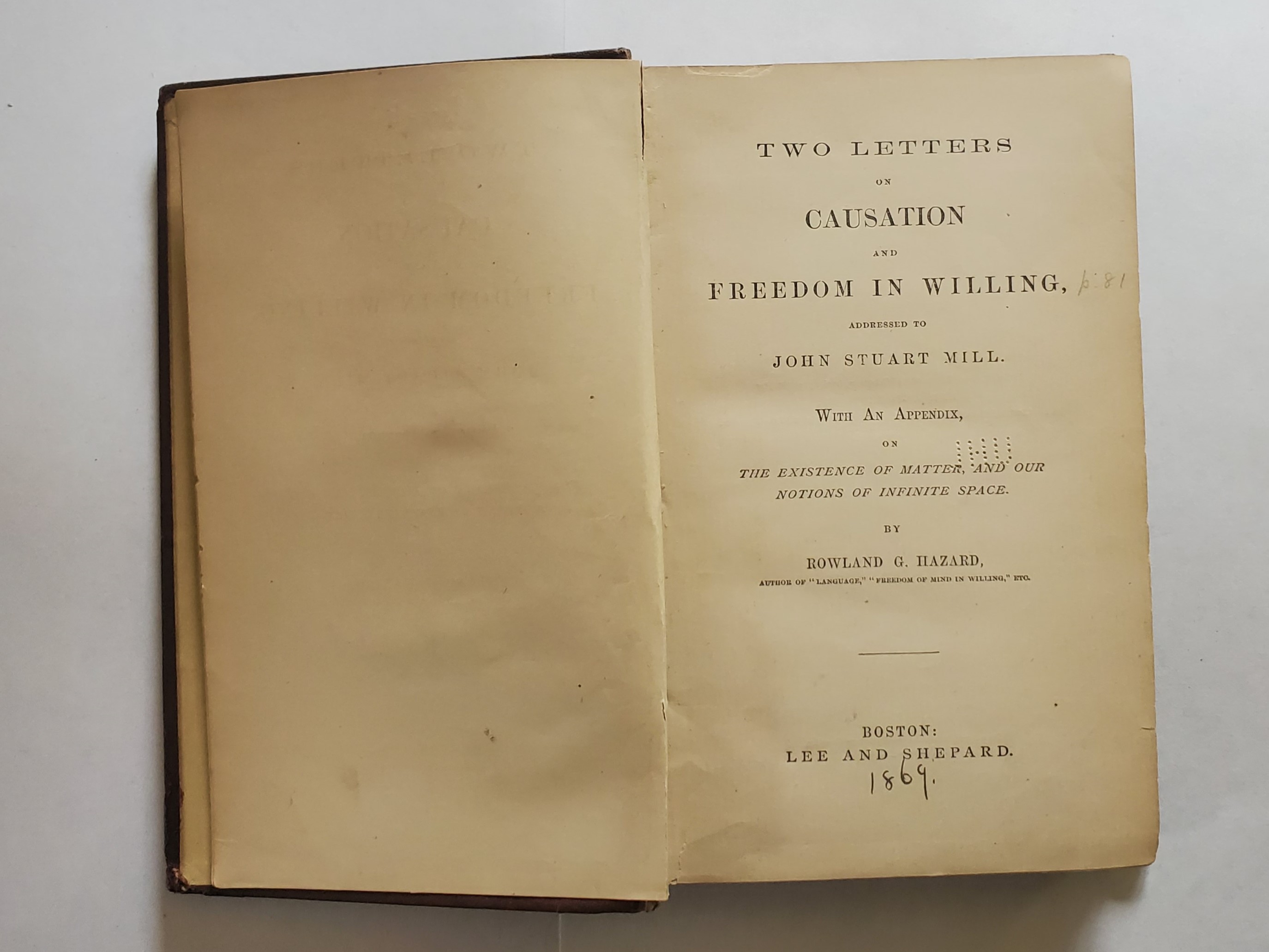 HAZARD, Rowland G. Two Letters on Causation and Freedom in Willing, addressed to John Stuart Mill. With an Appendix on the existence of matter, and our notions of infinite space. Boston, Lee and Shepard (1869)