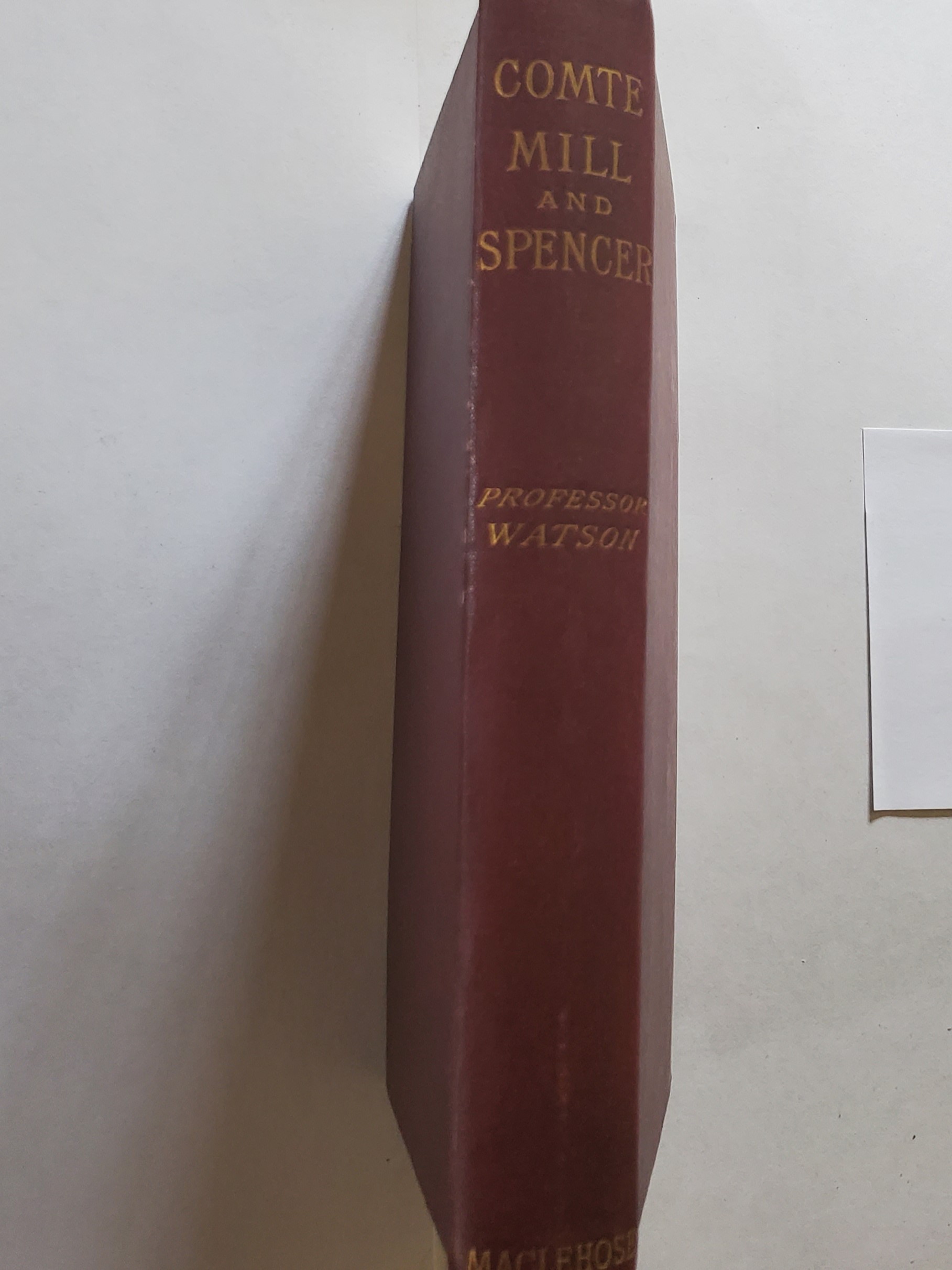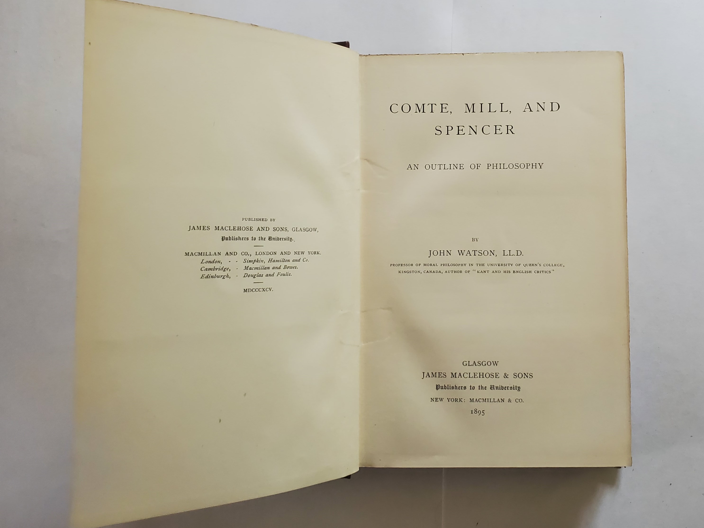 WATSON, J. Comte, Mill, and Spencer. An outline of philosophy. Glasgow, MacLehose, 1895