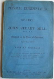 MILL,John Stuart. Personal Representation. Speech of John Stuart Mill Esq, M.P. delivered in the House of Commons, May 29th, 1867. With an Appendix containing notices of reports, discussions and publications on the system in France, Geneva, Germany, Belgium, Denmark, Sweden, the Australian Colonies and the United States. London, Henderson, Rait & Fenton....